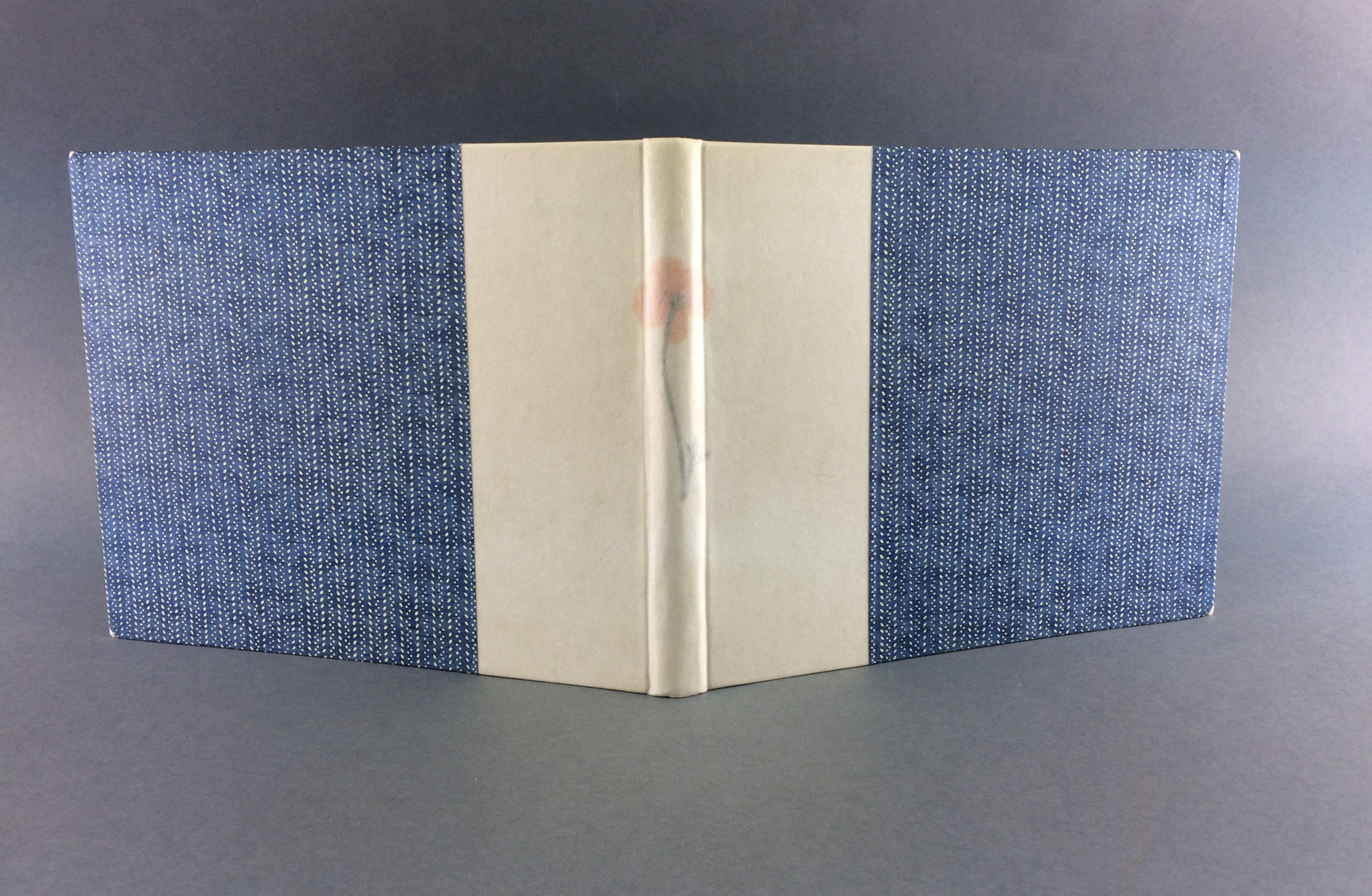 Cover of wedding album with parchment spine, decorative paper sides and a dried flower beneath the parchment on the spine.