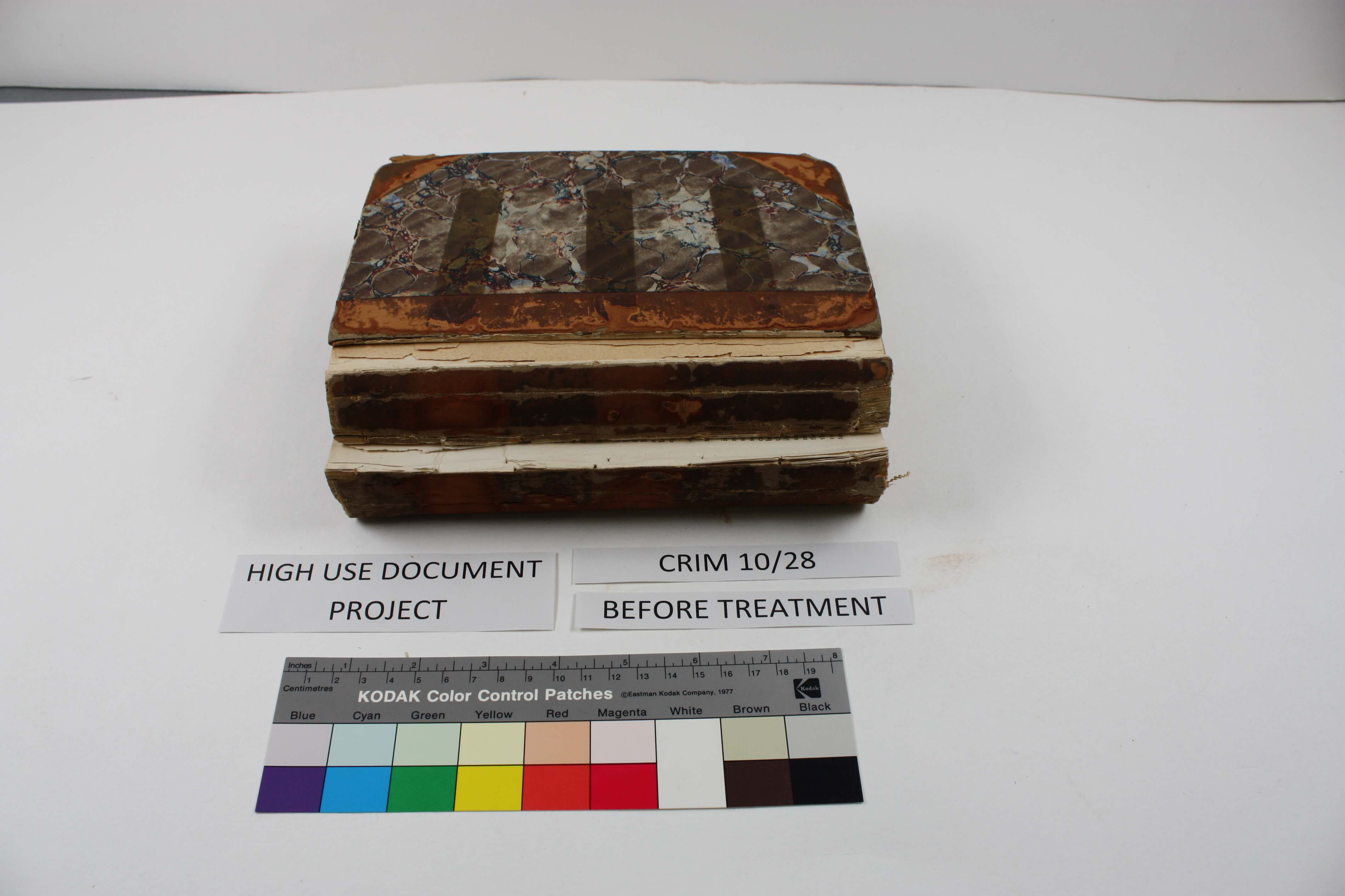 Before conservation treatment. Spine is split into several sections. Front board is detached.